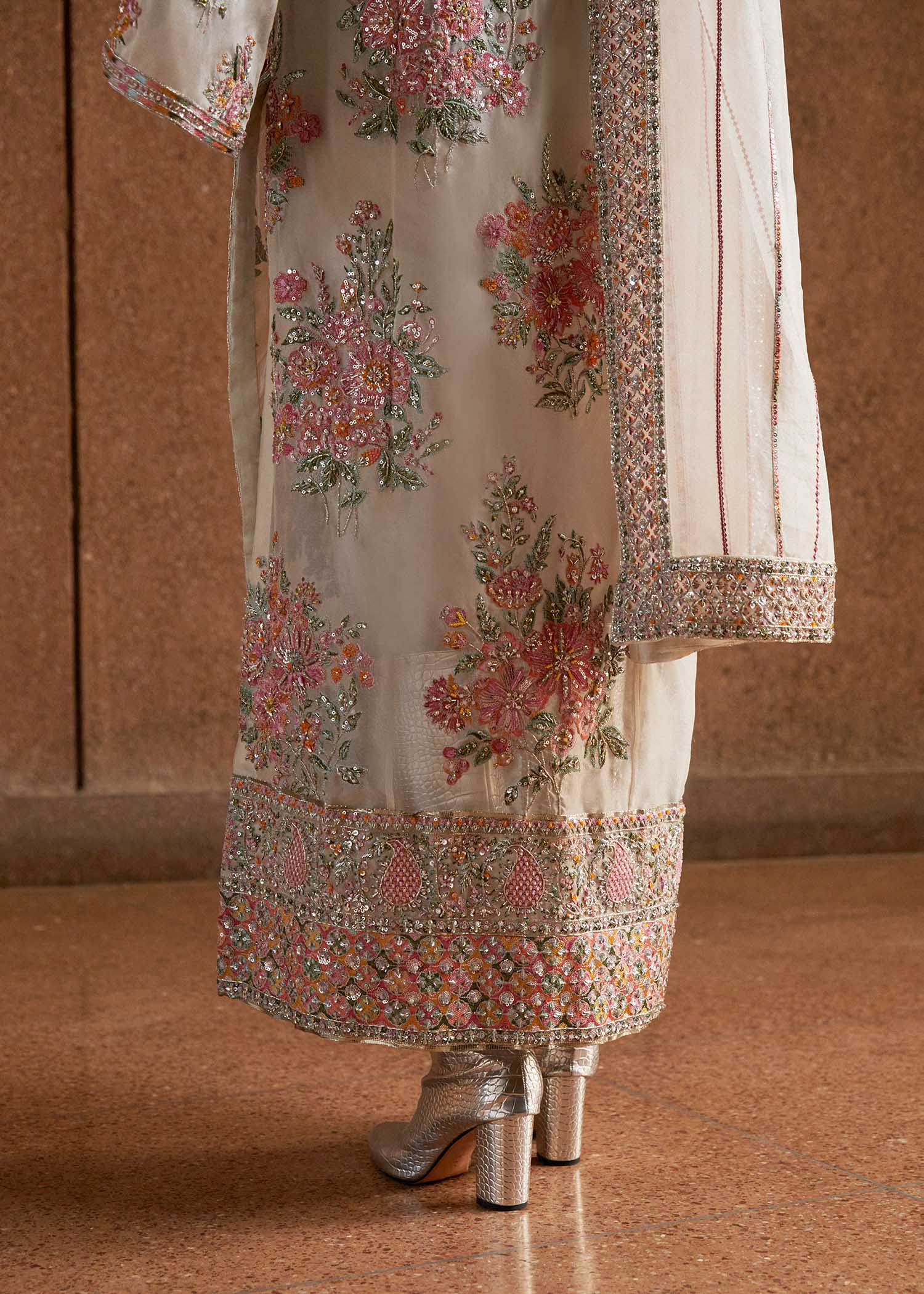 A perfect illustration of dazzling hues features stunning Ivory organza shirt with floral bunches embellished with intricate handwork details of sequins, resham, nakshi and dabka along with korean rawsilk choridar. Paired with a detailed embroidered organza duppata enhanced with intricate handwork details on four side border, setting a timeless appeal.